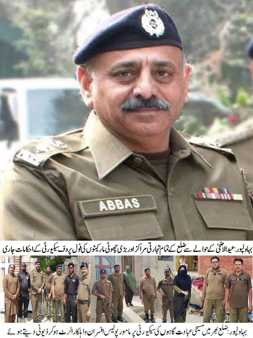 بہاول پور( )ڈسٹرکٹ پولیس آفیسر سید محمد عباس کی ہدایت پر مسیحی عبادت گاہوں کی سیکیورٹی کے سخت انتظامات، سینکڑوں پولیس افسران و اہلکار ڈیوٹی پر تعینات، مسیحی برادری سمیت تمام شہریوں کی حفاظت ہمارے اولین فرائض میں شامل ہے، ڈی پی او سید محمد عباس۔