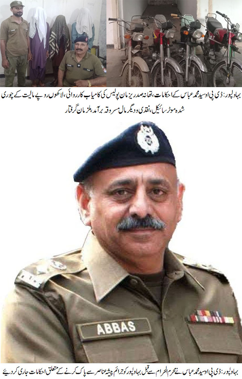 تفصیلات کے مطابق آئی جی پنجاب کی جرائم کی سرکوبی کیلئے جاری ہدایات اور ڈی پی او بہاولپور سید محمد عباس کی سربراہی میں جرائم پیشہ عناصر کے خلاف جاری مہم میں بڑی کامیابیاں ملنے کا سلسلہ جاری ہے۔ تھانہ صدر یزمان پولیس نے جدید ٹیکنالوجی کا استعمال کرتے ہوئے اسپیشل ٹیم تشکیل دے کر موٹر سائیکل چوری کی متعدد وارداتوں میں ملوث 04ملزمان طارق ، راشد، عمر اور اورنگزیب کو گرفتار کرلیا، جن سے متعدد مقدمات ٹریس ہوے۔ گرفتار ملزمان کے قبضہ سے لاکھوں روپے مالیتی 04 عدد چوری شدہ موٹر سائیکل لال واٹر پمپ اور نقد رقم مبلغ 95000/-روپے برآمد کرلئے۔ پولیس نے مختلف مقدمات میں ریکور شدہ موٹر سائیکل و دیگر مال مسروقہ مالکان کے حوالے کر دیا۔ ڈی پی او سید محمد عباس نے اس موقع پر کہا کہ شہریوں کا لوٹا ہوا مال جرائم پیشہ افراد سے ریکور کرایا جا رہا ہے تاکہ شہریوں کو زیادہ سے زیادہ ریلیف مہیا کیا جا سکے۔ انہوں نے مزید کہا بہاولپور پولیس جرائم کی بیخ کنی کیلئے بہترین حکمت عملی کو اپنا کر جرائم پیشہ افراد کا تدارک جاری رکھے گی۔