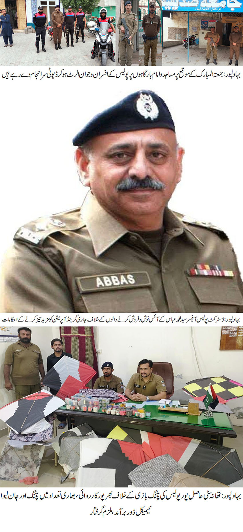 تفصیلات کے مطابق آئی جی پنجاب کی پتنگ بازی و پتنگ سازی سے متعلق جاری ہدایات پر عملدرآمد کو یقینی بناتے ہوئے ڈی پی او بہاولپور سید محمد عباس نے پولیس کو اس ضمن میں کارروائی کرنے کے احکامات جاری کیے تھے۔ جس کے نتیجہ میں تھانہ سٹی حاصل پور پولیس نے اسپیشل انفارمیشن پر پتنگ فروخت کرنے کو ریڈ کرکے گرفتار کرلیا،دوران کارروائی پتنگ فروش کی دوکان سے 50عدد مختلف رنگوں کی پتنگیں اور 60عدد کیمیکل ڈور کے گوٹ برآمد کر لئے۔ پولیس نے ملزم رحمان عبدالستار کو گرفتار کر کے مقدمہ درج کر لیا گیا، ملزم سے مزید تفتیش جاری ہے۔ ڈی پی او سید محمد عباس نے کہا پتنگ سازی کے کاروبار اور پتنگ بازی کرنا انتہائی ممنوع ہے یہ ایک خونی کھیل ہے۔ پتنگ بازی اور اس کاروبار میں ملوث افراد کے خلاف سخت سے سخت کاروائی عمل میں لائی جائے گی۔پتنگ بازی کھیل نہیں بلکہ جرم ہے کسی صورت رعایت نہیں برتی جائے گی کسی کو عوام الناس کی زندگیوں سے کھیلنے کی اجازت نہیں دی جا سکتی۔عوام الناس کے جان و مال کا تحفظ پولیس کی اولین ترجیح ہے۔