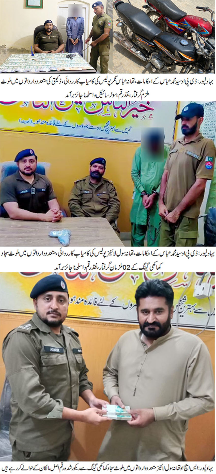 بہاولپور( )ڈی پی او سید محمد عباس کے احکامات، تھانہ سول لائینز پولیس کی کامیاب کارروائی، متعدد وارداتوں میں ملوث سجاد کھاکھی گینگ کے 02ملزمان گرفتار۔گرفتار ملزمان کے قبضہ سے دو لاکھ روپے سے زائد کی نقد رقم و اسلحہ ناجائز برآمد۔ معاشرے کے ایسے منفی عناصر کے خلاف مزید کارروائیاں جاری رکھی جائیں گی،ڈی پی او