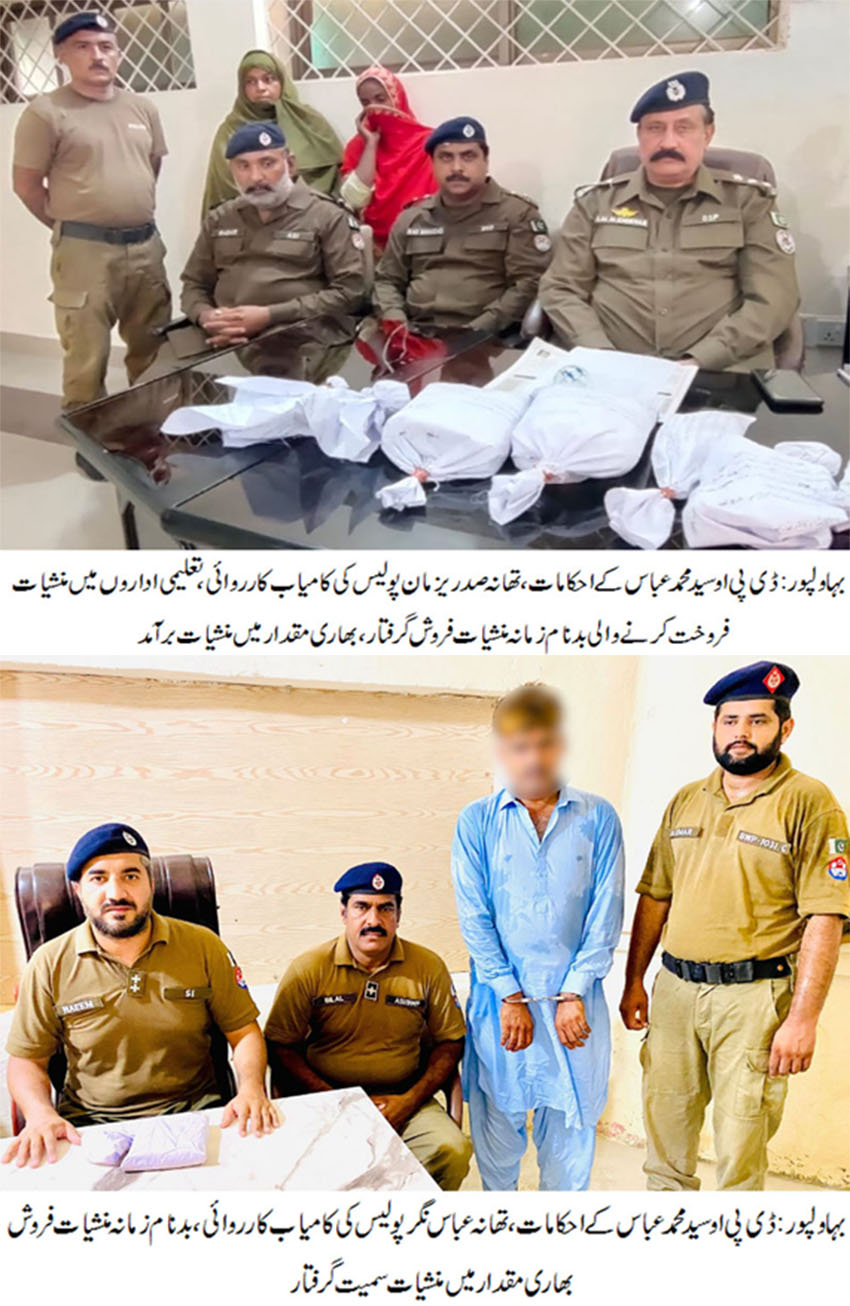 بہاولپور( )ڈی پی او سید محمد عباس کے احکامات، تھانہ صدر یزمان پولیس کی کامیاب کارروائی، تعلیمی اداروں میں منشیات فروخت کرنے والی بدنام زمانہ منشیات فروش گرفتار، لاکھوں روپے مالیتی ہیروئین و آئس برآمد۔تعلیمی اداروں جیسی مقدس جگہ پر ایسا گھنائونا کاروبار کرنے والے کسی رعایت کے مستحق نہیں ،ڈی پی او