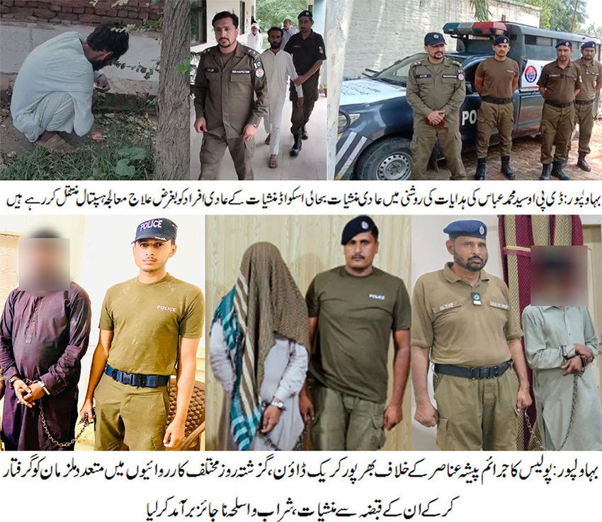 تفصیلات کے مطابق ڈی پی او بہاولپور سید محمد عباس کی طرف سے جرائم پیشہ افراد کے خلاف جاری مہم میں بڑی کامیابیاں ملنے کا سلسلہ جاری ہے۔ تھانہ کوتوالی، تھانہ کینٹ، تھانہ مسافر خانہ، تھانہ اوچشریف اور تھانہ ڈیراور پولیس نے منشیات فروشوں کے خلاف بھرپور کریک ڈائون کرتے ہوئے 07ملزمان عاطف عرف عاطی، ذیشان رفیق، ابراہیم، عمران، سلیم، سلیم شہزاد اور عباس کو گرفتار کرکے ان کے قبضہ سے 09کلو 190 گرام چرس جبکہ تھانہ خیر پور ٹامیوالی پولیس نے 01ملزم عقیل شیخ کو حراست میں لے کر اس کے قبضہ سے 30لیٹر دیسی شراب برآمد کرلی ۔اسی طرح اسلحہ ناجائز کے خلاف کارروائیاں عمل میں لاتے ہوئے تھانہ خیرپورٹامیوالی اور تھانہ بغداد الجدید پولیس 02ملزمان حسن اور تنویر کو گرفتار کرکے ان کے قبضہ سے 02 عدد پسٹل 30بور برآمد کرلئے ۔ گرفتار ملزمان کے خلاف علیحدہ علیحدہ مقدمات درج کر کے تفتیش شروع کر دی۔ اس موقع پر ڈی پی او سید محمد عباس نے اپنے پیغام میں کہا کہ جرم جیسا بھی ہو قانون سے کسی صورت بچ نہیں سکتا، شراب اور منشیات ایک لعنت ہے،معاشرے کو ایسے ناسور عناصر سے پاک کرنا پولیس کی اولین ترجیح ہے۔