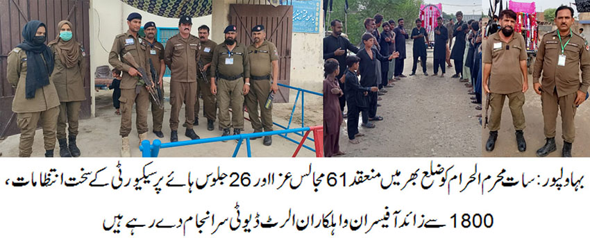 تفصیل کے مطابق آئی جی پنجاب ، آر پی او بہاولپور اور ڈی پی او بہاولپور سید محمد عباس کی ہدایات پر محرم الحرام میں سیکیورٹی کے سخت انتظامات کیے گئے ۔ سات محرم الحرام کو ضلع بھر میں 61 مجالس اور 26 جلوس برآمد ہوئے۔ جلوس و مجالس کی سیکیورٹی پر 1800 سے زائد پولیس اہلکار و وولنٹیرز نے ڈیوٹی سر انجام دی۔ شرکا کی سیکیورٹی کیلئے شرکت کرنے والوں کو تین سطحی چیکنگ کے عمل سے گزارا جا رہا ہے ۔گردو نواح میں ڈولفن اسکواڈ، ایلیٹ فورس، ایگل اسکواڈ گشت پر مامور جبکہ سول پارچات میں سیکورٹی اہلکار فرائض سرانجام دے رہے ہیں۔ جلوس اور مجالس میں شامل ہونے والے شرکا کی مکمل تلاشی لی جا رہی ہے اور جلوس کے راستے میں شامل دیگر راستوں کو خاردار تاروں سے بند کیا۔ خواتین کی تلاشی کے لئے لیڈیز پولیس بھی موجود رہی۔ مجلس کے چاروں اطراف ڈیوٹی لگائی گئی۔ سی سی ٹی وی کیمروں کی مدد سے سخت مانیٹرنگ کو یقینی بنایا گیا۔ تمام ایس ڈی پی اوز اور ایس ایچ اوز کو جلوس شروع ہونے سے پہلے روٹ کی سیکیورٹی چیک کرنے کی ہدایت کی گئی۔ جلوس کے راستے میں آنے والی بلند عمارتوں پر پولیس کے جوان مسلح مامور کئے گئے۔ پولیس کے ساتھ دیگر معاون ادارے اپنے اپنے فرائض سرانجام دینے میں مصروف ہیں۔ ڈی پی او بہاولپور نے ضلع بھر کے ایس ڈی پی اوز اور ایس ایچ اوز کو سیکیورٹی انتظامات کی کڑی نگرانی اور ڈیوٹی پر موجود ملازمان کو ڈیوٹی کی حساسیت کے بارے میں بریف کرنے کی ہدایت کی ہے۔