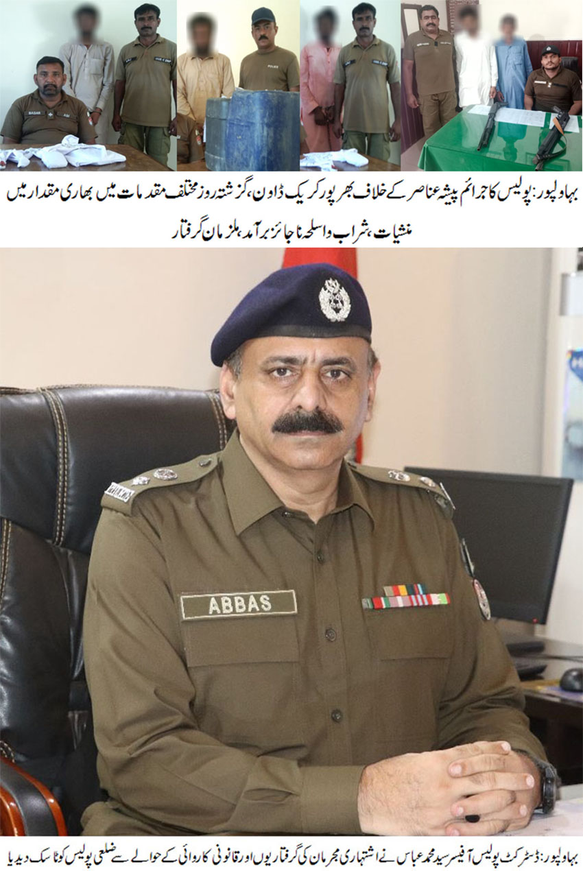 بہاولپور( )پولیس کا جرائم پیشہ عناصر کے خلاف بھرپور کریک ڈاون، گزشتہ روز مختلف مقدمات میں 07 ملزمان گرفتار۔ گرفتار ملزمان سے بھاری مقدار میں منشیات،شراب و اسلحہ ناجائز برآمد، ملزمان پابند سلاسل۔معاشرے کے ایسے منفی عناصر کسی رعائت کے مستحق نہیں، ڈی پی او سید محمد عباس