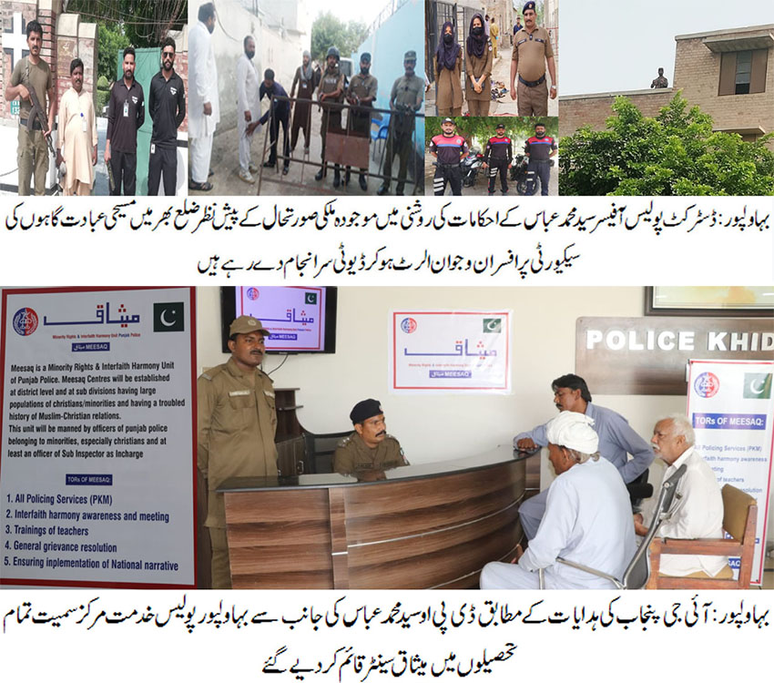 تفصیلات کے مطابق آئی جی پنجاب ڈاکٹر عثمان انور کی ہدایات کے مطابق  اقلیتی برادری کے تحفظ اور موجودہ صورت حال کے ہیش نظر بہاولپور پولیس خدمت مرکز سمیت تمام تحصیلوں حاصلپور، یزمان، احمد پور شرقیہ اور خیر پور ٹامیوالی میں میثاق سینٹرز قائم کر دیے گئے۔  جس میں پولیس کا پڑھا لکھا سٹاف تعینات کیا گیا ہے۔ پنجاب پولیس پیغمبر پاک حضرت محمد صلی اللہ علیہ والہ وسلم کے میثاق مدینہ کے عہد اور پاکستان کے قومی بیانیہ کی روشنی میں تمام شہریوں کے مساوی حقوق کو انتہائی اہمیت دیتی ہے ۔ان حقوق کا تحفظ یقینی بناتے ہوئے،میثاق سینٹر بہاولپور میں اقلیتوں خاص طور پر مسیحی برادری اور ہندو برادری کا ترجیحی بنیادوں پر خیال رکھا جا رہا ہے۔ اقلیتوں کے حقوق کے تحفظ اور بین المذاہب ہم آہنگی کو فروغ دینے کے لیے پنجاب پولیس بہاولپور کی جانب سے قائم میثاق سینٹر 24گھنٹے تمام غیر مسلم کمیونٹیز کے پولیس سے متعلق مسائل کے ترجیحی بنیادوں پر حل کے لئے خدمات کا سلسلہ جاری رکھے ہوئے ہے۔ڈی پی او سید محمد عباس نے اس موقع پر بات کرتے ہوئے کہا کہ اقلیتی برادری سمیت تمام شہریوں کے حقوق کا تحفظ یقینی بنانا ہماری اولین ذمہ داری ہے۔ انہوں نے مزید کہا کہ شر پسند عناصر کو بھی واضح پیغام ہیکہ کسی صورت امن و امان کی صورتحال خراب نہیں کرنے دیں گے۔