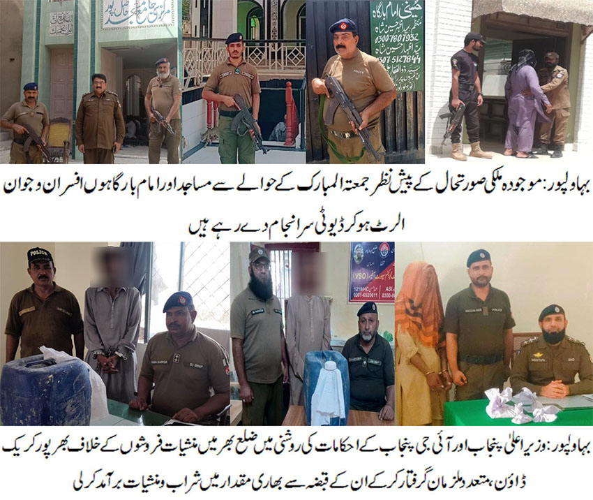 بہاول پور( )ڈی پی او سید محمد عباس کے احکامات، جمعتہ المبارک کے روز ایس ڈی پی اوز اور ایس ایچ اوز کے سیکیورٹی کے حوالے سے مساجد اور امام بارگاہوں کے وزٹ،موجودہ ملکی صورتحال کے پیش نظر ڈیوٹی پر مامور اہلکاروں کو الرٹ رہنے کی ہدایت،سیکیورٹی فرائض میں غفلت ہرگز برداشت نہیں کی جائے گی،ڈسٹرکٹ پولیس آفیسر سید محمد عباس