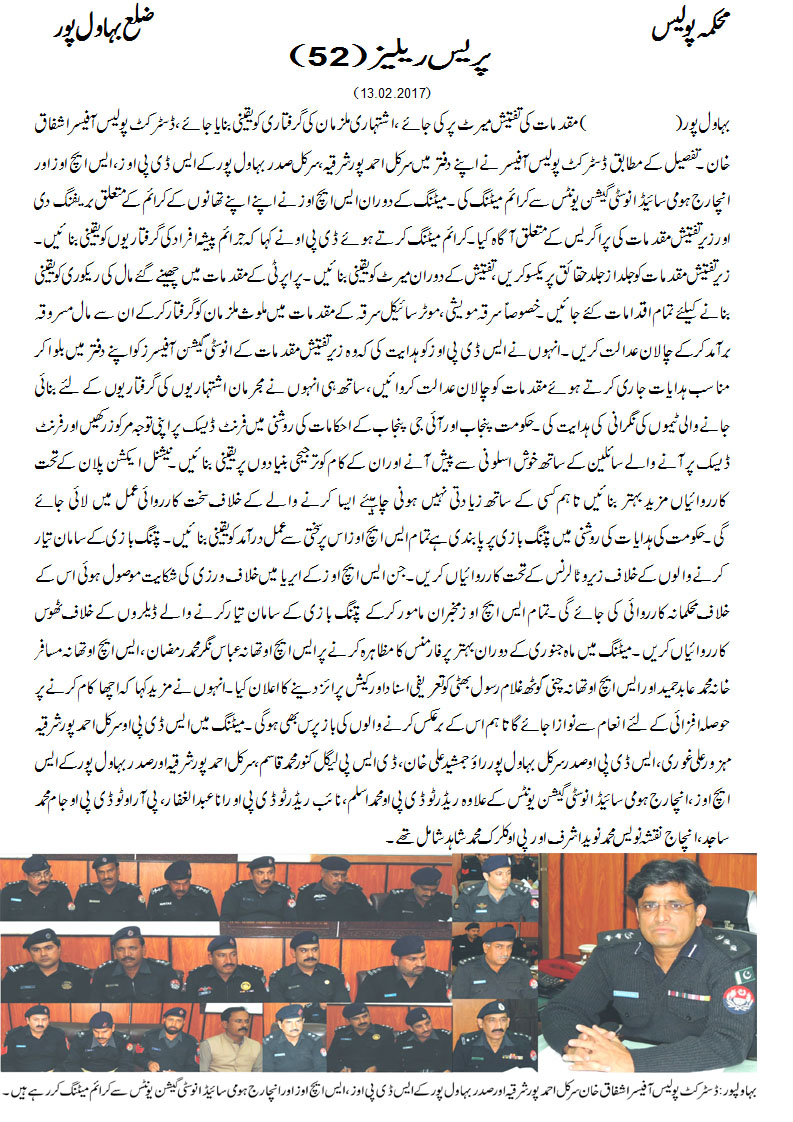 مقدمات کی تفتیش میرٹ پر کی جائے ،اشتہاری ملزمان کی گرفتاری یقینی بنایا جائے، ڈسٹرکٹ پولیس آفیسر بہاولپور اشفاق احمد خان