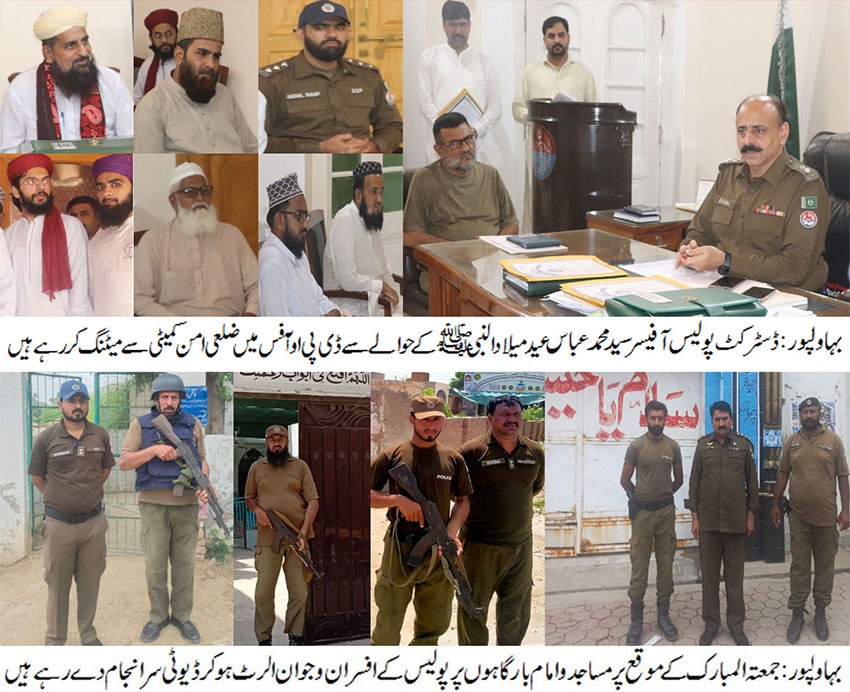 بہاولپور( )ڈسٹرکٹ پولیس آفیسر سید محمد عباس کی زیر صدارت عید میلاد النبیۖ کے سلسلہ میں ڈی پی او آفس میں ضلعی امن کمیٹی کے ممبران کا اجلاس ہوا۔ علما کرام کی طرف سے محرم الحرام اور چہلم پر بہترین سیکیورٹی پر بہاولپور پولیس کو خراج تحسین پیش کیا گیا۔ اجلاس سے خطاب کرتے ہوئے ڈسٹرکٹ پولیس آفیسر نے کہا کہ اسلام محبت اور رواداری کا درس دیتا ہے ۔عید میلاد النبیۖ کے حوالے سے ضلع میں بھائی چارے اور امن وامان کی فضا کو برقرار رکھا جائے گا، ڈی پی او