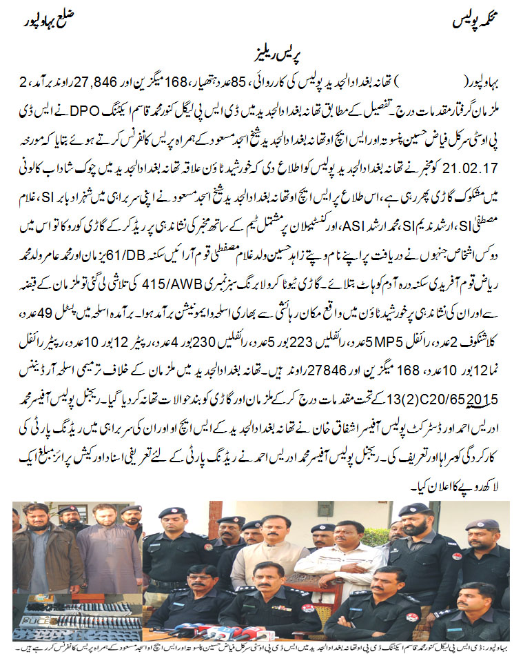 پولیس اسٹیشن بغداد الجدید کی کارروائی 85عدد ہتھیار 168 میگزین ،27846 راوند برآمد 2 ملزمان گرفتار مقدمہ درج