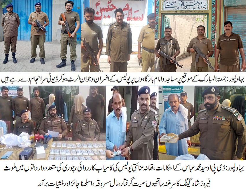 تفصیلات کے مطابق آئی جی پنجاب کی جرائم کی سرکوبی کیلئے جاری ہدایات اور ڈی پی او بہاولپور سید محمد عباس کی سربراہی میں جرائم پیشہ عناصر کے خلاف جاری مہم میں بڑی کامیابیاں ملنے کا سلسلہ جاری ہے۔ایس ایچ او تھانہ عنائتی نے ایس ڈی پی او سرکل خیر پور ٹامیوالی کی زیرنگرانی جدید ٹیکنالوجی کا استعمال کرتے ہوئے اسپیشل ٹیمیں تشکیل دے کر چوری کی متعدد وارداتوں میں ملوث فیروز گینگ کو ساتھیوں سمیت گرفتار کرلیا، گرفتار ملزمان میں فیروز شاہ ، شان شاہ اور صابر علی شامل ہیں۔ جن سے متعدد مقدمات ٹریس ہوئے۔ گرفتار ملزمان کے قبضہ سے نقد رقم 2,50,000/-روپے، 01عدد موٹر سائیکل 125،03 تولہ سونا ، 40تولہ چاندی ، 06شاخ بکریاں، قیمتی موبائل فونز ، زنانہ اور مردانہ سوٹ جبکہ گرفتار دیگر منشیات فروش ملزمان سے 1720گرام چرس ، 135لیٹر دیسی شراب ، 02عدد چالوبھٹیاں اور وارداتوں میں استعمال ہونے والا اسلحہ ناجائز برآمد کرلیا۔ ریکور شدہ موٹر سائیکل ودیگر مال مسروقہ اصل مالکان کے حوالے کئے جارہے ہیں۔اسی طرح تھانہ عنائتی پولیس نے مجرمان اشتہاریوں کے خلاف کارروائیاں عمل میں لاتے ہوئے 10عدالتی مفرور اور 16مجرمان اشتہاریوں کو گرفتار کرلیا۔ ڈی پی او سید محمد عباس نے اس موقع پر کہا کہ شہریوں کا لوٹا ہوا مال جرائم پیشہ افراد سے ریکور کرایا جا رہا ہے تاکہ شہریوں کو زیادہ سے زیادہ ریلیف مہیا کیا جا سکے۔ انہوں نے مزید کہا بہاولپور پولیس جرائم کی بیخ کنی کیلئے بہترین حکمت عملی کو اپنا کر جرائم پیشہ افراد کا تدارک جاری رکھے گی۔ ڈی پی او سید محمد عباس نے بہترین کارکردگی پر ایس ایچ او تھانہ عنائتی و ٹیم کو شاباش دی۔