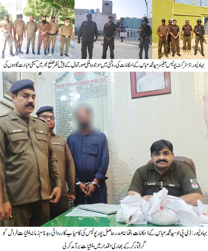 تفصیلات کے مطابق آئی جی پنجاب کی سماج دشمن عناصر کی سرکوبی کیلئے جاری ہدایات اور ڈی پی او بہاولپور سید محمد عباس کی سربراہی میں منشیات فروشوں کے خلاف جاری مہم میں بڑی کامیابیاں ملنے کا سلسلہ جاری ہے۔ ایس ایچ او تھانہ صدر حاصل پور نے منشیات فروشوں کے خلاف کارروائیاں عمل میں لاتے ہوئے سپیشل ٹیم تشکیل دے کر بدنام زمانہ منشیات فروش سجاد حسین کو گرفتار کرکے اس کے قبضہ سے 02 کلو 50 گرام چرس برآمد کرکے ملزم کو بند حوالات کیا۔ بعد اندراج مقدمہ مزید تفتیش جاری ہے۔ اس موقع پر ڈی پی او بہاولپور سید محمد عباس نے اپنے پیغام میں کہا کہ ایسے گھنانے جرائم کرنے والے جرائم پیشہ افراد کے خلاف اسی طرح کریک ڈان کرتے ہوئے مزید موثر کارروائیاں عمل میں لائی جائیں گی تاکہ معاشرے کو ایسے منفی عناصر سے پاک کیا جاسکے اور بہاولپور سے منشیات جیسی زہر کو مکمل طور پر ختم کیا جا سکے۔