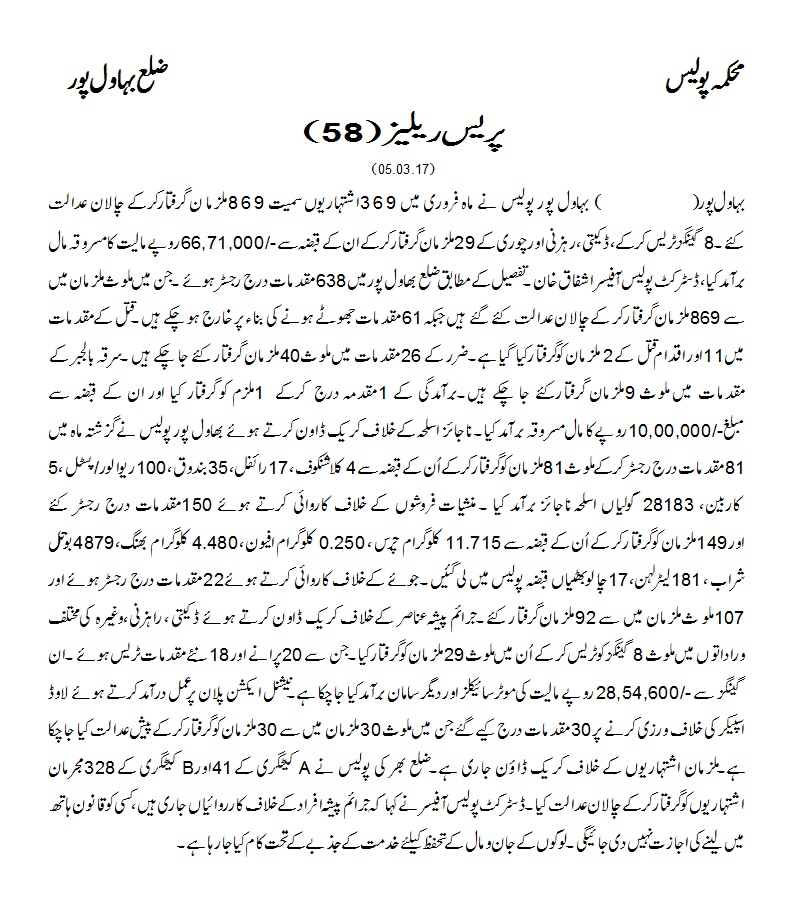 بہاولپور پولیس نے فروری میں 369 اشتہاریوں سمیت 869 ملزمان گرفتار کرکے چلان عدالت کیے 8 گینگزٹریس کرکے ڈکیتی رہزنی اور چوری کے 29 ملزمان گرفتار کرکے مال مسروقہ برآمد کیا