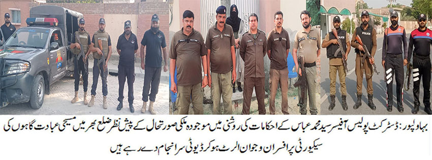 بہاولپور( )ڈسٹرکٹ پولیس آفیسر سید محمد عباس کے احکامات کی روشنی میں مسیحی عبادت گاہوں کی سیکیورٹی کے سخت انتظامات، سینکڑوں پولیس افسران و اہلکار ڈیوٹی پر تعینات، مسیحی برادری سمیت تمام شہریوں کی حفاظت ہمارے اولین فرائض میں شامل ہے، ڈی پی او سید محمد عباس