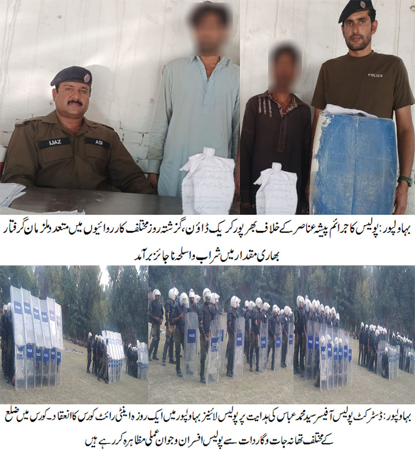 تفصیلات کے مطابق ڈی پی او بہاولپور سید محمد عباس کی طرف سے جرائم پیشہ افراد کے خلاف جاری مہم میں بڑی کامیابیاں ملنے کا سلسلہ جاری ہے۔ تھانہ صدر احمد پور شرقیہ ، تھانہ عنائتی اور تھانہ خیر پور ٹامیوالی پولیس نے شراب فروشوں کے خلاف کارروائیاں عمل میں لاتے ہوئے 05ملزمان صادق، عابد، رضوان، صفدر حسین اور حسن سلیم کو گرفتار کرکے ان کے قبضہ سے 140لیٹر شراب برآمد کرلی۔اسی طرح اسلحہ ناجائز رکھنے والوں کے خلاف ایکشن لیتے ہوئے تھانہ مسافرخانہ، تھانہ صدر احمد پور شرقیہ اور تھانہ سٹی یزمان پولیس نے 03 ملزمان طارق، عطا محمد اور شاہد حسین کو گرفتار کرکے ان کے قبضہ سے 03عدد پسٹل 30بور برآمد کرلئے۔ گرفتار ملزمان کے خلاف علیحدہ علیحدہ مقدمات درج کر کے تفتیش شروع کر دی۔ اس موقع پر ڈی پی او سید محمد عباس نے اپنے پیغام میں کہا کہ جرم جیسا بھی ہو قانون سے کسی صورت بچ نہیں سکتا، شراب اور منشیات ایک لعنت ہے، معاشرے کو ایسے ناسور عناصر سے پاک کرنا پولیس کی اولین ترجیح ہے۔