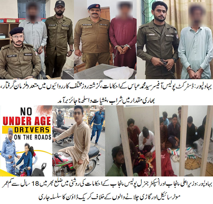 بہاولپور( )وزیر اعلی پنجاب اور انسپکٹر جنرل آف پولیس پنجاب کے احکامات کی روشنی میں ضلع بھر میں 18سال سے کم عمر موٹر سائیکل اور گاڑی چلانے والوں کے خلاف کریک ڈان کا سلسلہ جاری ۔ متعدد کم عمر لڑکے گرفتار ، چالان اور جرمانے بھی کئے جاچکے۔ "اپنے بچوں کو مجرم بننے سے بچائیں" قانون کی پاسداری ہم سب پر فرض ہے، ڈسٹرکٹ پولیس آفیسر سید محمد عباس