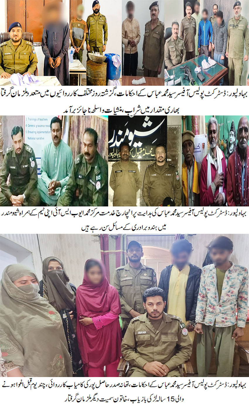تفصیلات کے مطابق ڈی پی او بہاولپور سید محمد عباس کی طرف سے جرائم پیشہ افراد کے خلاف جاری مہم میں بڑی کامیابیاں ملنے کا سلسلہ جاری ہے۔ شراب فروشوں کے خلاف کامیاب کارروائی عمل میں لاتے ہوئے تھانہ سٹی احمد پور شرقیہ، تھانہ اوچشریف، تھانہ نوشہرہ جدید اور تھانہ ہیڈ راجکاں پولیس نے 05ملزمان عباس شاہد، رشید احمد، ربنواز، نعمان حیدر اور عبدالطیف کو گرفتار کرکے اس کے قبضہ سے 290لیٹر شراب اور 01عدد چالوبھٹی برآمد کرلی۔اسی طرح منشیات فروشوں کے خلاف گھیرا تنگ کرتے ہوئے تھانہ کینٹ اور تھانہ نوشہرہ جدید (چوکی ہتھیجی) پولیس نے 03ملزمان عابد، عبیر سلیم اور طاہر کھوکھر کو گرفتار کرکے ان کے قبضہ سے 02کلو 700گرام چرس اور 18گرام کرسٹل آئس برآمد کرلی۔جبکہ تھانہ سول لائینز ،تھانہ نوشہرہ جدید، تھانہ سٹی یزمان، تھانہ صدر حاصل پور اور تھانہ قائم پور پولیس نے اسلحہ ناجائز رکھنے والوں کے خلاف ایکشن لیتے ہوئے 07ملزمان اسد، نوید، حبیب احمد، غلام حیدر، اکمل، آصف اور عمران عرف مانی کو گرفتار کرکے ان کے قبضہ سے 01عدد کلاشنکوف، 01عدد کاربین 12بور، 02عدد رپیٹر 12بور اور 03عدد پسٹل 30بور برآمد کرلئے۔ گرفتار ملزمان کے خلاف علیحدہ علیحدہ مقدمات درج کر کے تفتیش شروع کر دی۔ اس موقع پر ڈی پی او سید محمد عباس نے اپنے پیغام میں کہا کہ جرم جیسا بھی ہو قانون سے کسی صورت بچ نہیں سکتا، شراب، منشیات کے ساتھ ساتھ اسلحہ ناجائز رکھنے والوں کے خلاف جاری آپریشن کو مزید تیز کیا جارہا ہے، معاشرے کو ایسے ناسور عناصر سے پاک کرنا پولیس کی اولین ترجیح ہے۔