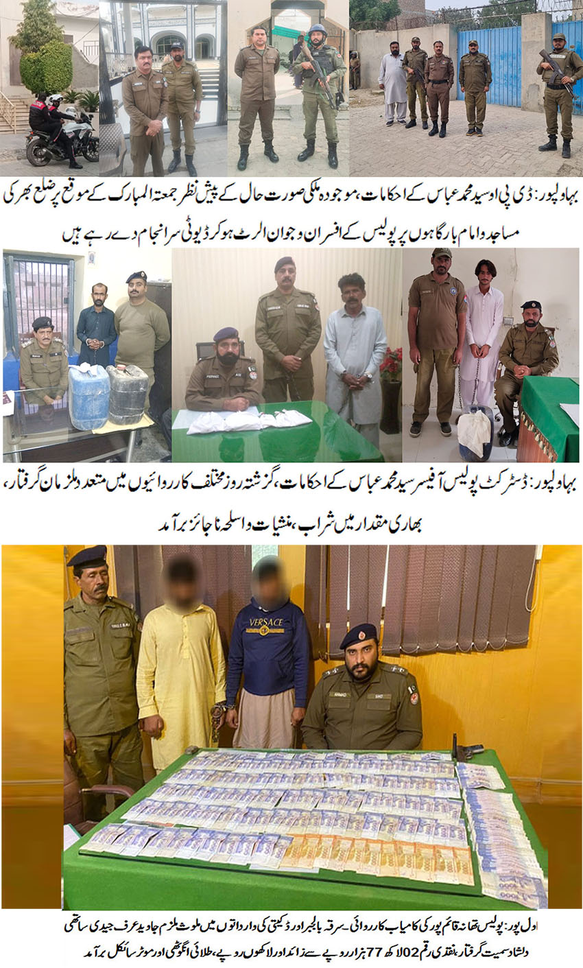 بہاولپور( )ڈسٹرکٹ پولیس آفیسر سید محمد عباس کے احکامات ، گزشتہ روز مختلف کارروائیوں میں متعددملزمان گرفتار۔گرفتار ملزمان سے بھاری مقدار میں شراب،منشیات و اسلحہ ناجائز برآمد، ملزمان پابند سلاسل۔ جرائم پیشہ افراد کا تعاقب جاری رکھا جائیگا، ڈی پی او سید محمد عباس