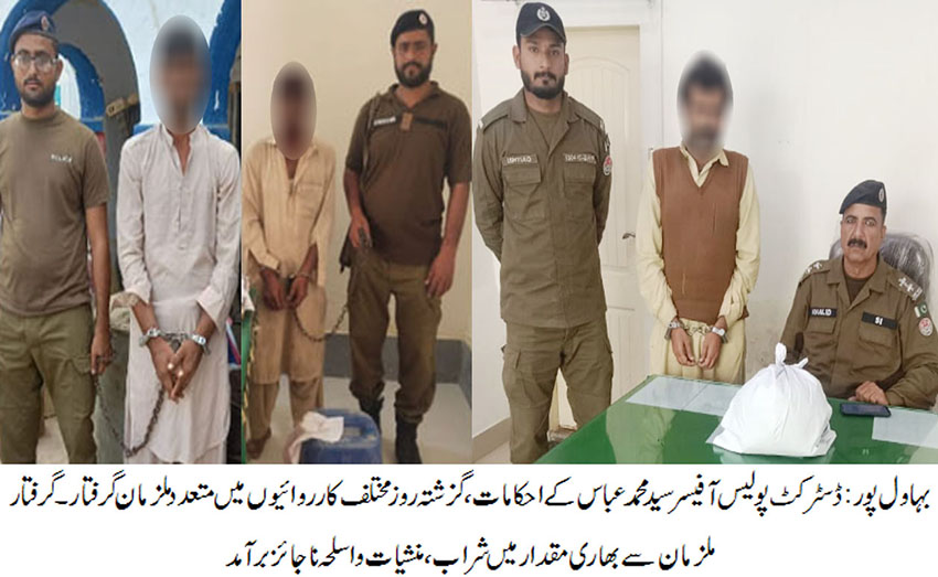 بہاول پور( )ڈسٹرکٹ پولیس آفیسر سید محمد عباس کے احکامات ، گزشتہ روز مختلف کارروائیوں میں متعددملزمان گرفتار۔گرفتار ملزمان سے بھاری مقدار میں شراب،منشیات و اسلحہ ناجائز برآمد، ملزمان پابند سلاسل۔ جرائم پیشہ افراد کا تعاقب جاری رکھا جائیگا، ڈی پی او سید محمد عباس
