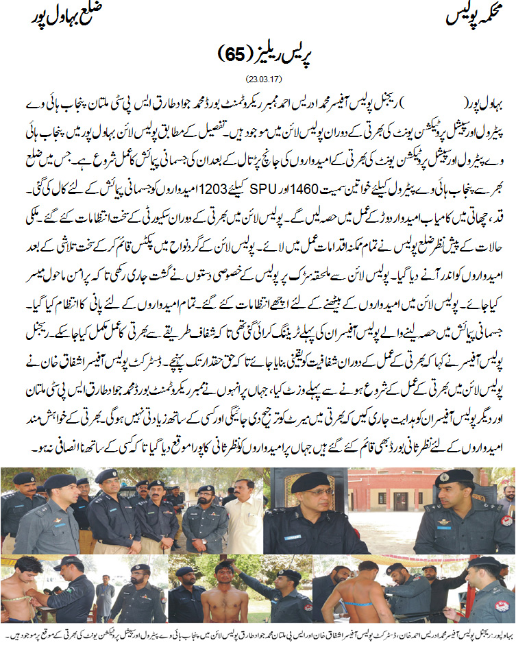 ریجنل پولیس آفیسر محمد ادریس احمد ،ممبر ریکورٹمنٹ بورڈ محمد جواد طارق ایس پی سٹی ملتان، بہاولپور پولیس لائنز میں پنجاب ہائی وے پیٹرول اور اسپیشل پروٹیکشن یونٹ کی بھرتی میں موجود