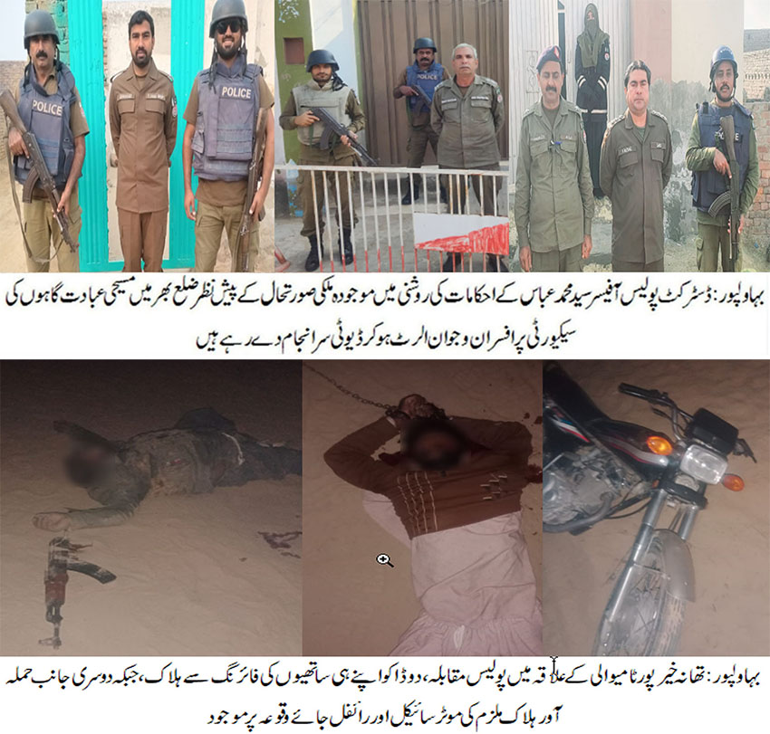 تفصیلات کے مطابق تھانہ خیرپورٹامیوالی پولیس کے پاس ایک ملزم اشرف عرف اشری پٹواری ڈکیتی کے مقدمہ میں جسمانی ریمانڈ پر موجود تھا جس سے ڈکیتی شدہ موٹرسائیکل ریکور کی جانی تھی۔پولیس ٹیم ملزم کو لیکرخیرپورٹامیوالی کے علاقہ میں موٹرسائیکل برآمدگی کے لیے گئی اور ملزم کی نشاندھی پرموٹرسائیکل برآمد کرنے کے بعد واپس آرہی تھی کہ اسی دوران نذرباغ کے قریب پولیس پر04کس نقاب پوش نامعلوم ملزمان نے جوکہ دو موٹرسائیکلوں پر تھے ، اپنے ساتھی کو چھڑانے کے لئے پولیس پراندھا دھند فائرنگ کردی۔ پولیس نے بھی حفاظت خود اختیاری کے تحت رکاوٹ کا سہارا لیتے ہوئے دو چار جوابی فائر کیے۔ فائرنگ رکنے کے بعد دیکھا توحملہ آور سمیت گرفتارملزم بھی اپنے ہی ساتھیوں کی فائرنگ سے ہلاک ہوچکاتھا۔ حملہ آور ملزم کی شناخت ای پولیس پوسٹ سے مشتاق داد پوترا کے نام سے ہوئی جو کہ تھانہ عنائیتی کا اشتہاری ملزم تھا جبکہ بقیہ تین نامعلوم ملزمان فائرنگ کرتے ہوئے اور اندھیرے کا فائدہ اٹھاتے ہوئے ایک ہنڈا 125اور ایک رائفل پھینک کرفرار ہوگئے۔پولیس کی بھاری نفری نے موقع پر پہنچ کر علاقے کو گھیر لیااورفرار 03کس ملزمان کی گرفتاری کیلئے پولیس کی اسپیشل ٹیمیں آپریشن کر رہی ہیں۔واضح رہے کہ ہلاک ڈاکو اشرف عرف اشری پٹواری پر 59 سنگین مقدمات درج ہیں جبکہ حملہ آور ہلاک ڈاکو مشتاق داد پوترا 50 سے زائد سنگین مقدمات میں پولیس کو مطلوب تھا۔ مزید تفتیش و تحقیقات جاری۔ڈسٹرکٹ پولیس آفیسر نے اس حوالے سے بات کرتے ہوئے کہا کہ ملزمان اپنی موت آپ مر گئے۔ بہاولپور پولیس کی طرف سے زیرو ٹالرنس پالیسی اپنائی گئی ہے۔ جرائم پیشہ افراد کیلئے واضح پیغام ہے۔انہوں نے مزید کہا کہ بہاولپور کے شہریوں کے جان و مال کا تحفظ ہر صورت یقینی بنایا جائے گا۔ تھانہ خیرپورٹامیوالی پولیس کوبہادری و جوانمردی سے مقابلہ کرنے پر ڈی پی او نے شاباش دی۔