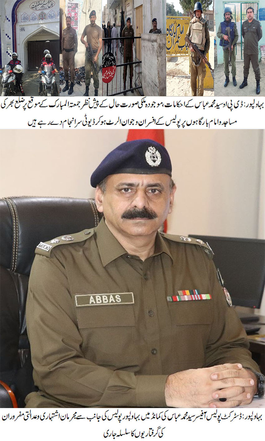 بہاول پور( )ڈی پی او سید محمد عباس کے احکامات، جمعتہ المبارک کے روز ایس ڈی پی اوز اور ایس ایچ اوز کے سیکیورٹی کے حوالے سے مساجد اور امام بارگاہوں کے وزٹ،موجودہ ملکی صورتحال کے پیش نظر ڈیوٹی پر مامور اہلکاروں کو الرٹ رہنے کی ہدایت، سیکیورٹی فرائض میں غفلت ہرگز برداشت نہیں کی جائے گی، ڈسٹرکٹ پولیس آفیسر سید محمد عباس