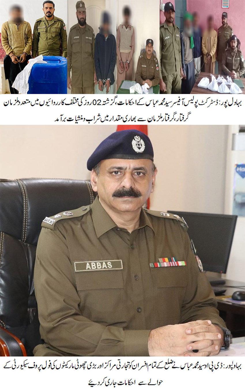 تفصیلات کے مطابق ڈی پی او بہاولپور سید محمد عباس کی طرف سے جرائم پیشہ افراد کے خلاف جاری مہم میں بڑی کامیابیاں ملنے کا سلسلہ جاری ہے۔تھانہ کینٹ ، تھانہ عباس نگر ، تھانہ سمہ سٹہ، تھانہ سٹی احمد پور شرقیہ ، تھانہ اوچشریف اور تھانہ ہیڈراجکاں پولیس نے شراب فروشوں کے خلاف کارروائیاں عمل میں لاتے ہوئے 08ملزمان شان مسیح، شہزاد عرف سنی مسیح، مظہر حسین، رضا مسیح،شاہد پھل، ہاشم، جعفر اور فیصل رضوان کو گرفتار کرکے ان کے قبضہ سے 370لیٹر شراب برآمد کرلی۔جبکہ تھانہ کوتوالی، چنی گوٹھ، تھانہ اوچشریف ،تھانہ سٹی حاصل پور اور تھانہ صدر حاصل پور پولیس نے منشیات فروشوں کے گرد گھیرا تنگ کرتے ہوئے 09ملزمان رشید ، جمشید ، اشرف عرف اچھو،دلشاد، ثنا اللہ ، اسلام، جاوید اقبال، صدیق بھٹی اور رمضان کو گرفتار کرکے ان کے قبضہ سے 06کلو 670گرام چرس ،920گرام ہیروئن اور 01کلو 960گرام افیون برآمد کرلی۔ گرفتار ملزمان کے خلاف علیحدہ علیحدہ مقدمات درج کر کے تفتیش شروع کر دی۔ اس موقع پر ڈی پی او سید محمد عباس نے اپنے پیغام میں کہا کہ جرم جیسا بھی ہو قانون سے کسی صورت بچ نہیں سکتا، سماج دشمن عناصر کے خلاف جاری آپریشن کو مزید تیز کیا جارہا ہے، معاشرے کو ایسے ناسور عناصر سے پاک کرنا پولیس کی اولین ترجیح ہے۔