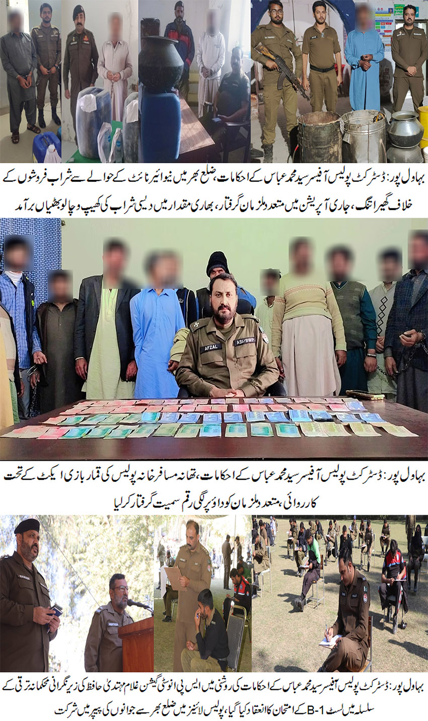 تفصیلات کے مطابق ڈی پی او بہاولپور سید محمد عباس کی طرف سے نیوائیر نائٹ کے حوالے سے جاری احکامات کی روشنی میں جرائم پیشہ افراد کے خلاف جاری مہم میں بڑی کامیابیاں ملنے کا سلسلہ جاری ہے۔تھانہ سول لائینز، عباس نگر، ڈیرہ نواب صاحب، اوچشریف، خیر پور ٹامیوالی اور تھانہ سٹی حاصل پور پولیس نے شراب فروشوں کے خلاف کامیاب کارروائیاں عمل میں لاتے ہوئے 11ملزمان ظفر اقبال، حسنین، ظفرحسین، مزمل عرف مجی، افتخار احمد، شہباز تھہیم، فلک شیر، عطا محمد،خضر عباس، لطیف اور بشیر احمد کو گرفتار کرکے ان کے قبضہ سے 847لیٹر دیسی شراب اور 03عدد چالو بھٹیاں برآمد کرلیں۔گرفتار ملزمان کے خلاف علیحدہ علیحدہ مقدمات درج کر کے تفتیش شروع کر دی۔ اس موقع پر ڈی پی او سید محمد عباس نے اپنے پیغام میں کہا کہ نیو ائیر نائٹ کے حوالے سے جاری آپریشن کو مزید تیز کیا جارہا ہے ، معاشرے کو ایسے ناسور عناصر سے پاک کرنا پولیس کی اولین ترجیح ہے۔