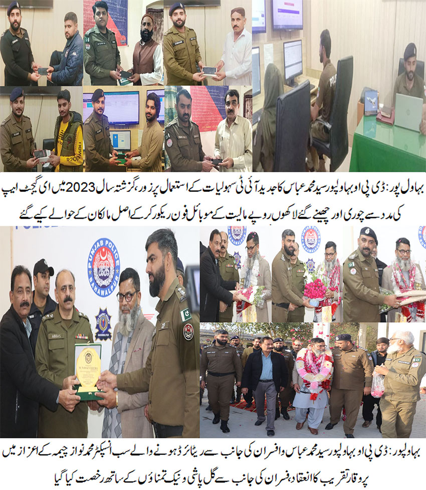 تفصیلات کے مطابق ڈی پی او بہاولپور سید محمد عباس نے جدید آئی ٹی سہولیات کو استعمال کرتے ہوئے ماڈرن پولیسنگ کے نظریہ کو فروغ دینے بارے ہدایات جاری کیں۔ڈی پی او بہاولپور سید محمد عباس کی کمانڈ میں جرائم پیشہ افراد کی سرکوبی کا سلسلہ جاری ہے ۔گزشتہ سال بہاولپور پولیس نے ای گیجٹ ایپ کی مدد سے لاکھوں روپے مالیت کے چوری شدہ 1810موبائل فون ریکور کرکے اصل مالکان کے حوالے کیے ۔پنجاب پولیس کے لیے ای ۔گیجٹ ایپ کا استعمال مثر ثابت ہو رہا ہے ۔ موبائل فون چوری یا چھین لیا جائے تو اس کو اب آسانی سے ریکور کیا جاسکتا ہے۔پنجاب پولیس نے ای گیجٹ نام کی موبائل ایپ متعارف کرائی ہے جسے آسانی سے پلے سٹور سے ڈان لوڈ کیا جا سکتا ہے، جس کے بعد کوئی بھی دکاندار اس کی مدد سے باآسانی جان سکے گا کہ اس کے پاس موجود موبائل فون جو کہ فروخت کرنے کیلئے آیا ہے کسی واردات میں ملوث یا چوری کا تو نہیں ہے جس بابت خدشہ ہونے یا علم ہونے کی صورت میں فوری متعلقہ پولیس کو اطلاع دی جاتی ہے دور حاضر میں پولیس کی جانب سے جدید ٹیکنالوجی کے استعمال سے کئی وارداتیں ٹریس کی جا رہی ہیں جس سے معاشرے میں پولیس کا وقار مزید بلند ہو رہا ہے۔