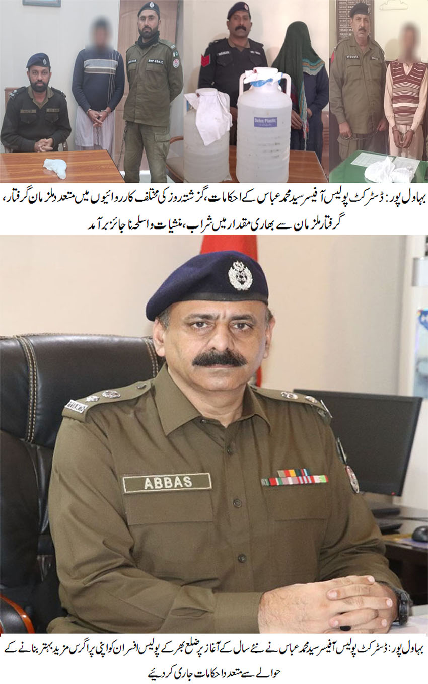 بہاو ل پور( )ڈی پی او سید محمد عباس کی طرف سے سال نو کے آغاز میں ہی جرائم پیشہ افراد کے خلاف گھیرا تنگ کرنے کے سخت احکامات جاری، گزشتہ سال کی طرح بلکہ اس سے بھی بہتر طور پر رواں سال منفی عناصر کی سرکوبی کو یقینی بنایا جائے، شہریوں کو ایک خوشگوار ماحول میں بہترین سروس ڈیلیوری بھی ناگزیر ہے۔ ڈی پی او سید محمد عباس کی افسران کو ہدایات