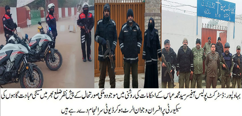بہاو ل پور( )ڈسٹرکٹ پولیس آفیسر سید محمد عباس کے احکامات کی روشنی میں مسیحی عبادت گاہوں کی سیکیورٹی کے سخت انتظامات، سینکڑوں پولیس افسران و اہلکار ڈیوٹی پر تعینات، مسیحی برادری سمیت تمام شہریوں کی حفاظت ہمارے اولین فرائض میں شامل ہے، ڈی پی او سید محمد عباس