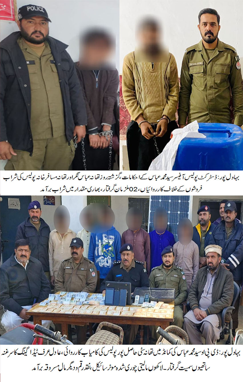 بہاول پور( )ڈسٹرکٹ پولیس آفیسر سید محمد عباس کے احکامات ، گزشتہ روز تھانہ عباس نگر اور تھانہ مسافرخانہ پولیس کی شراب فروشوں کے خلاف کارروائیاں، 02ملزمان گرفتار، بھاری مقدار میں شراب برآمد، ملزمان پابند سلاسل۔ جرائم پیشہ افراد کا تعاقب جاری رکھا جائیگا، ڈی پی او سید محمد عباس