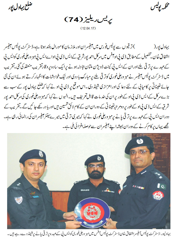 ترقیوں سے پولیس فورس میں آفیسران اور ملازمان کا مورال بلند ہوتا ھے ڈسٹرکٹ پولیس آفیسر بہاولپور اشفاق خان