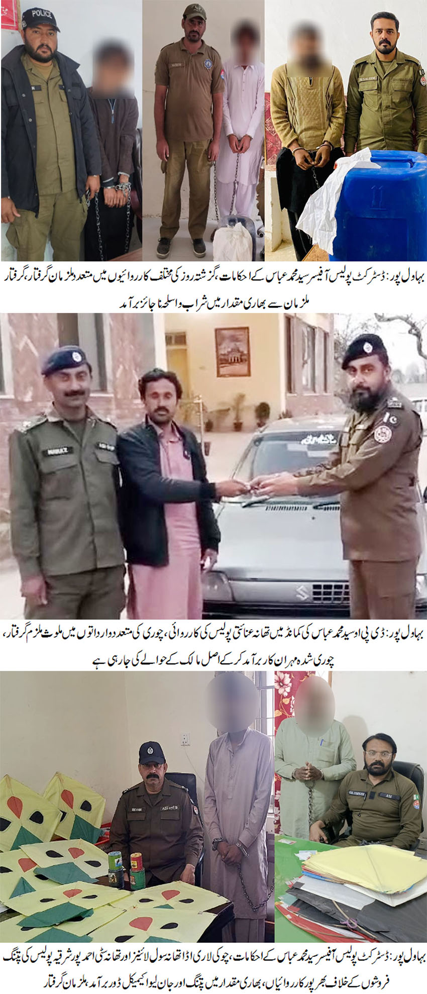 بہاول پور( )ڈسٹرکٹ پولیس آفیسر سید محمد عباس کے احکامات، گزشتہ روز کی مختلف کارروائیوں میں 05ملزمان گرفتار۔ گرفتار ملزمان سے بھاری مقدار میں شراب و منشیات برآمد، ملزمان پابند سلاسل۔ جرائم پیشہ افراد کا تعاقب جاری رکھا جائیگا، ڈی پی او سید محمد عباس