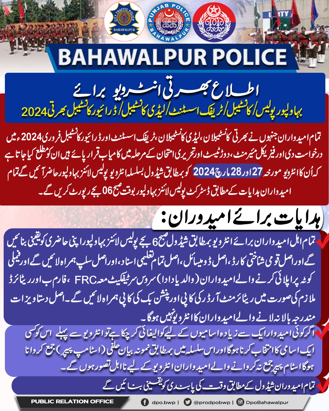کہ اُن کا انٹریوو مورخہ 27اور 28مارچ 2024کو بمطابق شیڈول بسلسلہ انٹریوو پو لیس لائنز بہاولپور حاضرآئیں گے تمام امیدواران ہدایات کے مطابق ڈسٹرکٹ پولیس لائنزبہاولپوربوقت صبح 06 بجے رپورٹ کریں گے۔
