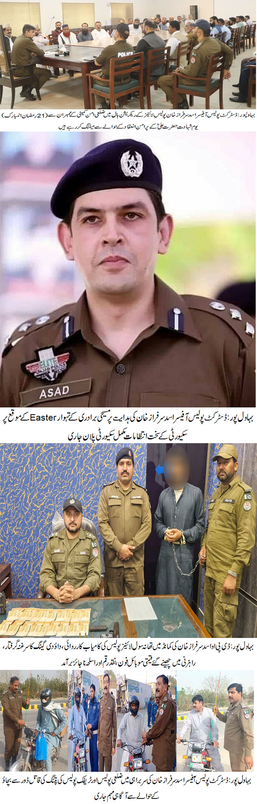 بہاول پور( )ڈسٹرکٹ پولیس آفیسر اسد سرفرازخان کی ہدایات کی روشنی میں مسیحی برادری کے تہوار Easter کے موقع پر سکیورٹی انتظامات مکمل سکیورٹی پلان جاری۔ مسیحی عبادتگاہوں، تفریحی مقامات و پارکس وغیرہ پر سینکڑوں پولیس افسران و جوان ڈیوٹی پر تعینات۔ مسیحی برادری سمیت تمام شہریوں کی حفاظت ہمارے اولین فرائض میں شامل ہے، ڈی پی او اسد سرفراز خان
