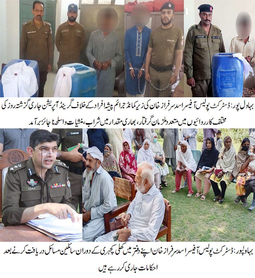 بہاول پور( )ڈسٹرکٹ پولیس آفیسر اسد سرفراز خان کی زیر کمانڈ جرائم پیشہ افراد کے خلاف گرینڈ آپریشن جاری، گزشتہ دو روز کی مختلف کارروائیوں میں 07ملزمان گرفتار۔ بھاری مقدار میں شراب، منشیات و اسلحہ ناجائز برآمد۔ جرائم پیشہ افراد کے خلاف جاری کارروائیوں کو مزید تیز کیا جارہا ہے ، ڈی پی او اسد سرفراز خان