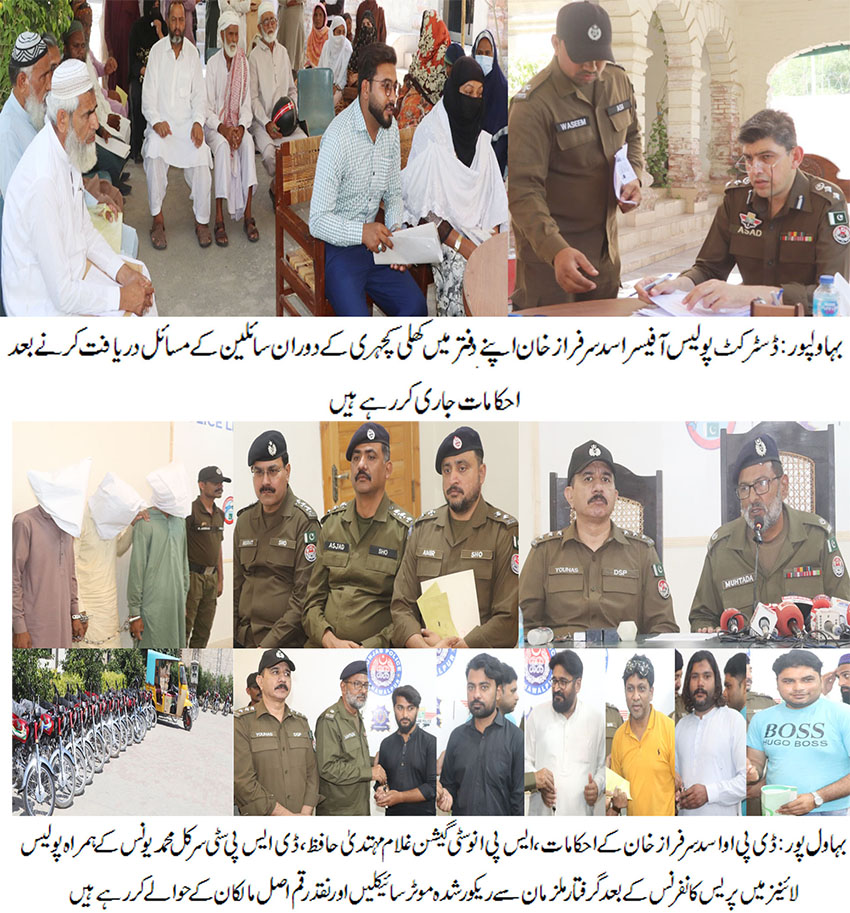 بہاولپور( )ڈسٹرکٹ پولیس آفیسر اسد سرفراز خان کا شہریوں کے مسائل ترجیحی بنیادوں پر حل کرنے کیلئے روزانہ کی بنیاد پر اپنے دفتر میں کھلی کچہری کا انعقاد، 30سے زائد شہریوں نے اپنے مسائل ڈی پی او کے سامنے رکھے۔برآمدگی کے مقدمات میں جلد ریکوری کرکے رپورٹ پیش کرنے کے احکامات جاری کیے،غفلت برتنے والے افسران سے جواب طلبی کی جائے،ڈی پی او اسد سرفراز خان
