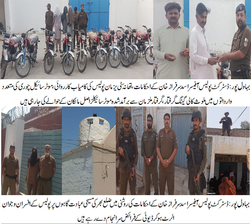 بہاول پور( )ڈی پی او اسد سرفراز خان کی کمانڈ میں بہاولپور پولیس کو جرائم پیشہ افراد کے خلاف کامیابیاں ملنے کا سلسلہ جاری، تھانہ سٹی یزمان پولیس کی کامیاب کارروائی موٹر سائیکل چوری کی متعدد وارداتوں میں ملوث کالی گینگ کا سرغنہ ساتھیوں سمیت گرفتار، گرفتار ملزمان سے لاکھوں روپے مالیتی چوری شدہ موٹر سائیکل برآمد۔ پولیس کی اصل کامیابی ہے شہریوں کا لوٹا ہوا مال واپس کرایا جائے اور ملزمان کو کیفر کردار تک پہنچایا جائے، ڈی پی او اسد سرفراز خان