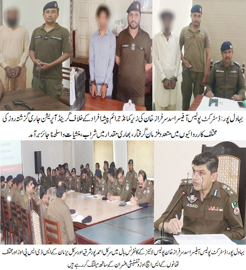 بہاول پور( )ڈسٹرکٹ پولیس آفیسر اسد سرفراز خان کی زیر کمانڈ جرائم پیشہ افراد کے خلاف گرینڈ آپریشن جاری، گزشتہ روز کی مختلف کارروائیوں میں 16ملزمان گرفتار۔ بھاری مقدار میں شراب، منشیات و اسلحہ ناجائز برآمد۔ جرائم پیشہ افراد کے خلاف جاری کارروائیوں کو مزید تیز کیا جارہا ہے ، ڈی پی او اسد سرفراز خان