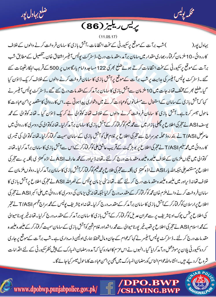 شبِ برآت کے موقع پر سکیورٹی کے سخت اقدامات ، آتش بازی کا سامان فروخت کرنے والوں کے خلاف کاروائی ،10 ملزمان گرفتار ،بھاری مقدار میں آتش بازی کا سامان برآمد، مقدمات درج