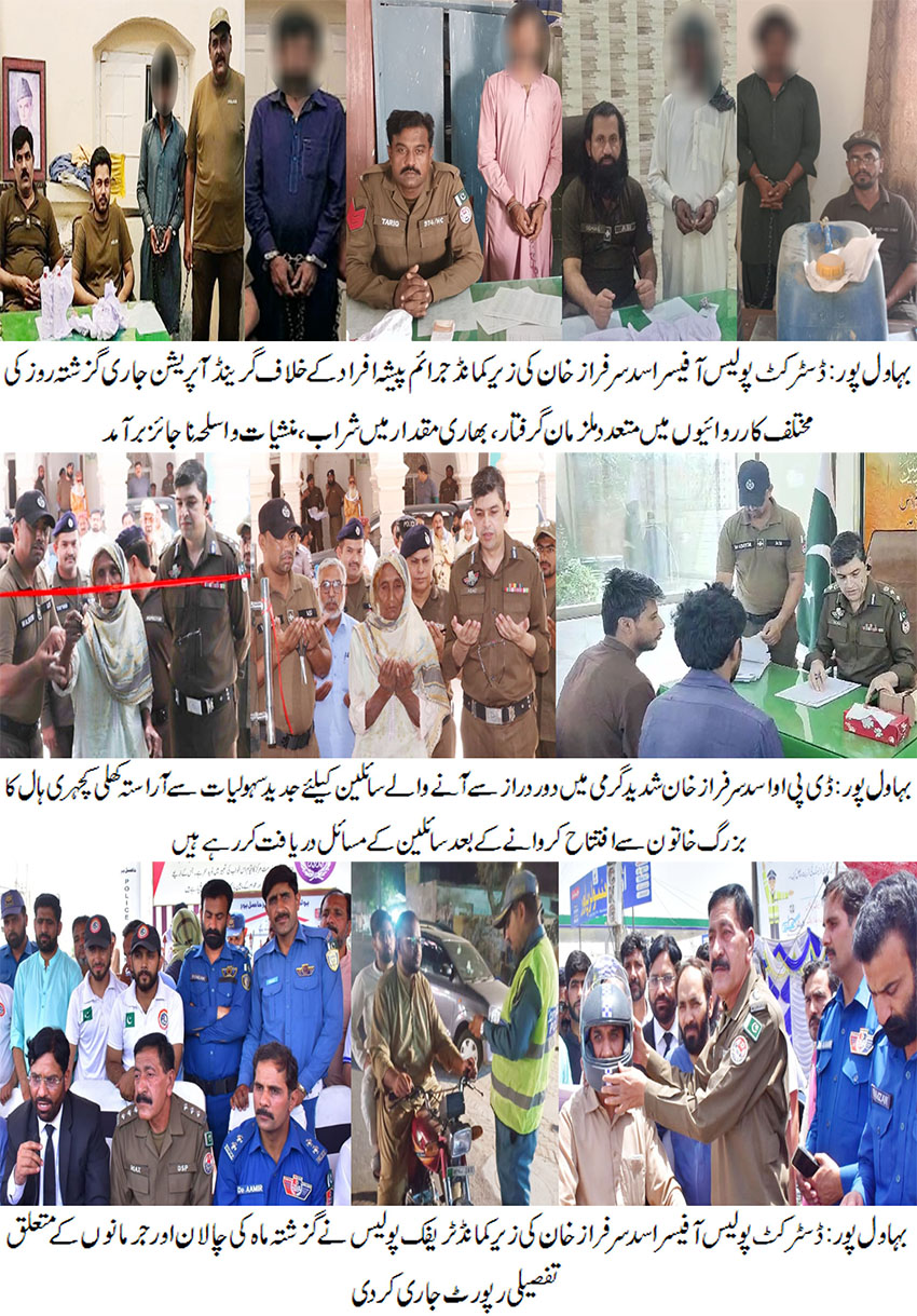 بہاول پور( )ڈسٹرکٹ پولیس آفیسر اسد سرفراز خان کی زیر کمانڈ جرائم پیشہ افراد کے خلاف گرینڈ آپریشن جاری، گزشتہ روز کی مختلف کارروائیوں میں 12ملزمان گرفتار۔ بھاری مقدار میں شراب، منشیات و اسلحہ ناجائز برآمد۔ جرائم پیشہ افراد کے خلاف جاری کارروائیوں کو مزید تیز کیا جارہا ہے ، ڈی پی او اسد سرفراز خان