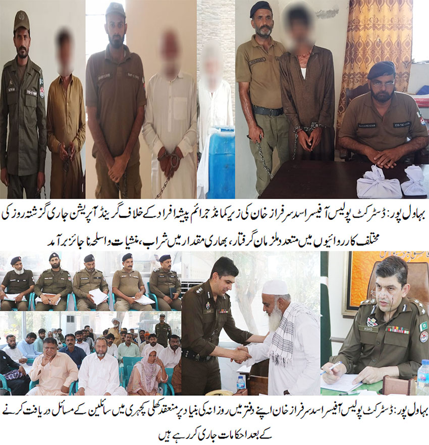 بہاول پور( )ڈسٹرکٹ پولیس آفیسر اسد سرفراز خان کی زیر کمانڈ جرائم پیشہ افراد کے خلاف گرینڈ آپریشن جاری، گزشتہ روز کی مختلف کارروائیوں میں 10ملزمان گرفتار۔ بھاری مقدار میں شراب، منشیات و اسلحہ ناجائز برآمد۔ جرائم پیشہ افراد کے خلاف جاری کارروائیوں کو مزید تیز کیا جارہا ہے ، ڈی پی او اسد سرفراز خان