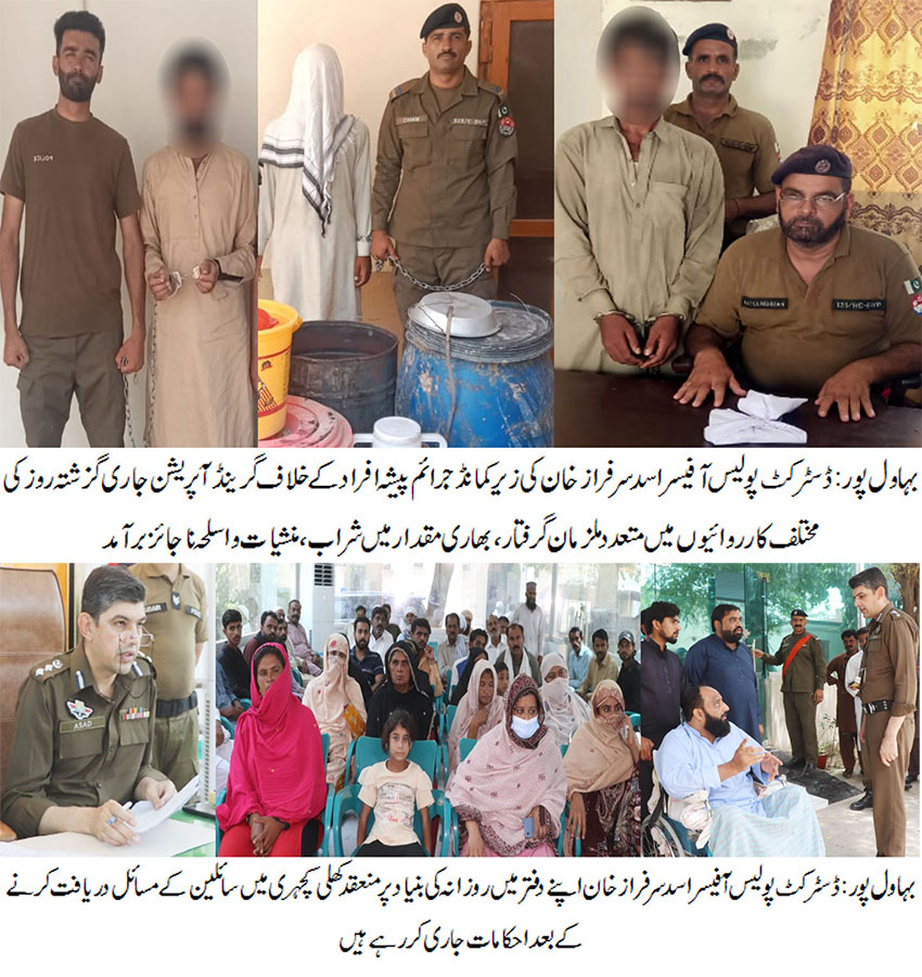 بہاول پور( )ڈسٹرکٹ پولیس آفیسر اسد سرفراز خان کی زیر کمانڈ جرائم پیشہ افراد کے خلاف گرینڈ آپریشن جاری، گزشتہ روز کی مختلف کارروائیوں میں 14ملزمان گرفتار۔ بھاری مقدار میں شراب، منشیات و اسلحہ ناجائز برآمد۔ جرائم پیشہ افراد کے خلاف جاری کارروائیوں کو مزید تیز کیا جارہا ہے ، ڈی پی او اسد سرفراز خان