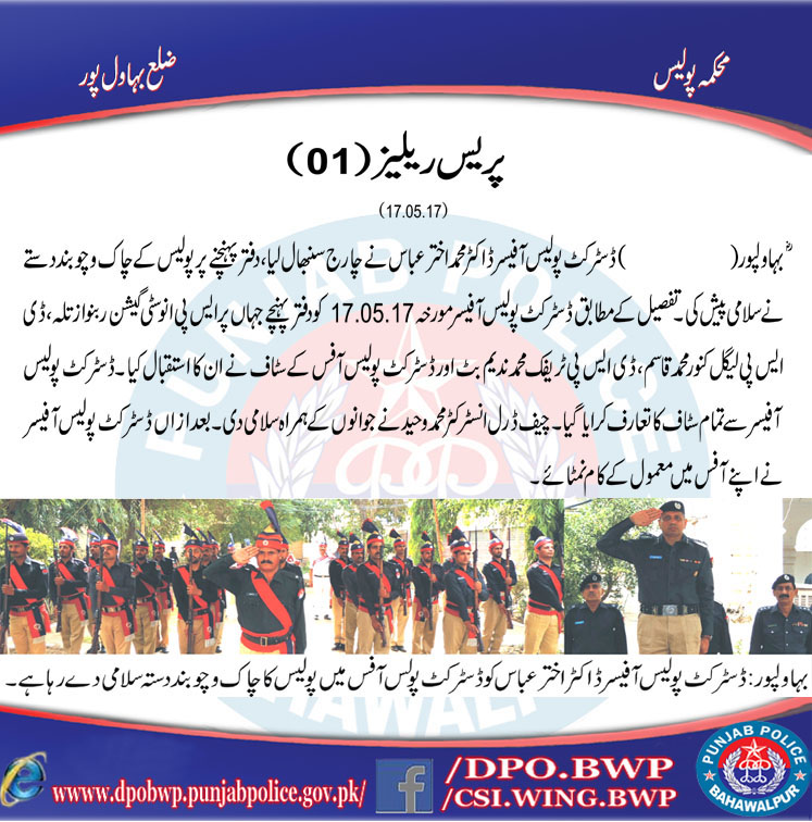 ڈسٹرکٹ پولیس آفیسر ڈاکٹر محمد اختر عباس نے چارج سنبھال لیا دفتر پہنچنے پر چاک وچوبند دستے نے سلامی پیش کی