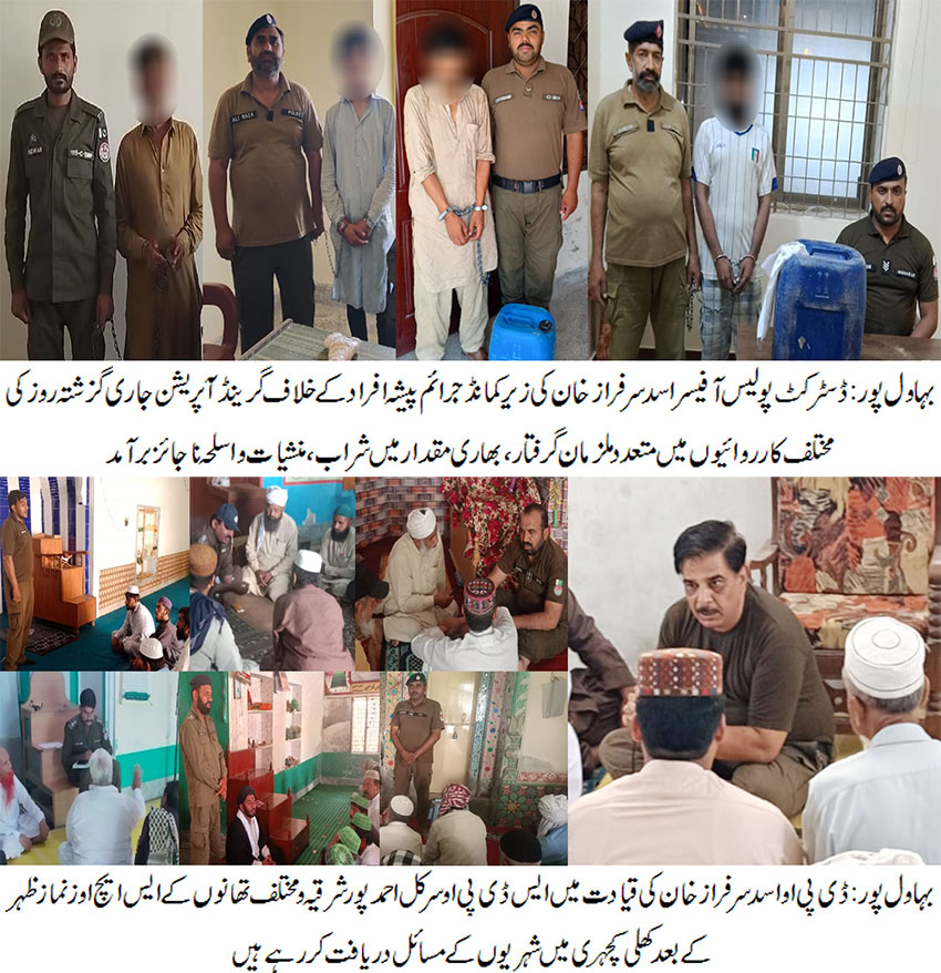 بہاول پور( )ڈسٹرکٹ پولیس آفیسر اسد سرفراز خان کی زیر کمانڈ جرائم پیشہ افراد کے خلاف گرینڈ آپریشن جاری، گزشتہ روز کی مختلف کارروائیوں میں 12ملزمان گرفتار۔ بھاری مقدار میں شراب، منشیات و اسلحہ ناجائز برآمد۔ جرائم پیشہ افراد کے خلاف جاری کارروائیوں کو مزید تیز کیا جارہا ہے ، ڈی پی او اسد سرفراز خان