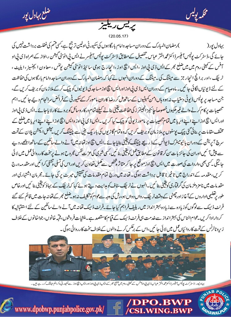 رمضان المبارک کے دوران مساجد و امام بارگاہوں کی سکیورٹی اولین ترجیح ھے، کسی قسم کی غفلت برداشت نہیں کی جائۓ گی ۔ڈسٹرکٹ پولیس آفیسر ڈاکٹر محمد اختر عباس
