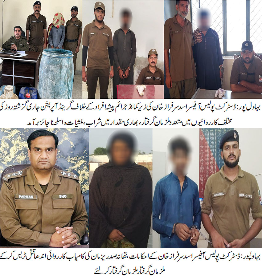 بہاول پور( )ڈسٹرکٹ پولیس آفیسربہاولپور اسد سرفراز خان کی زیر کمانڈ جرائم پیشہ افراد کے خلاف گرینڈ آپریشن جاری، گزشتہ روز کی مختلف کارروائیوں میں 11ملزمان گرفتار۔ بھاری مقدار میں شراب، منشیات و اسلحہ ناجائز برآمد۔ جرائم پیشہ افراد کے خلاف جاری کارروائیوں کو مزید تیز کیا جارہا ہے ، ڈی پی اوبہاولپور اسد سرفراز خان