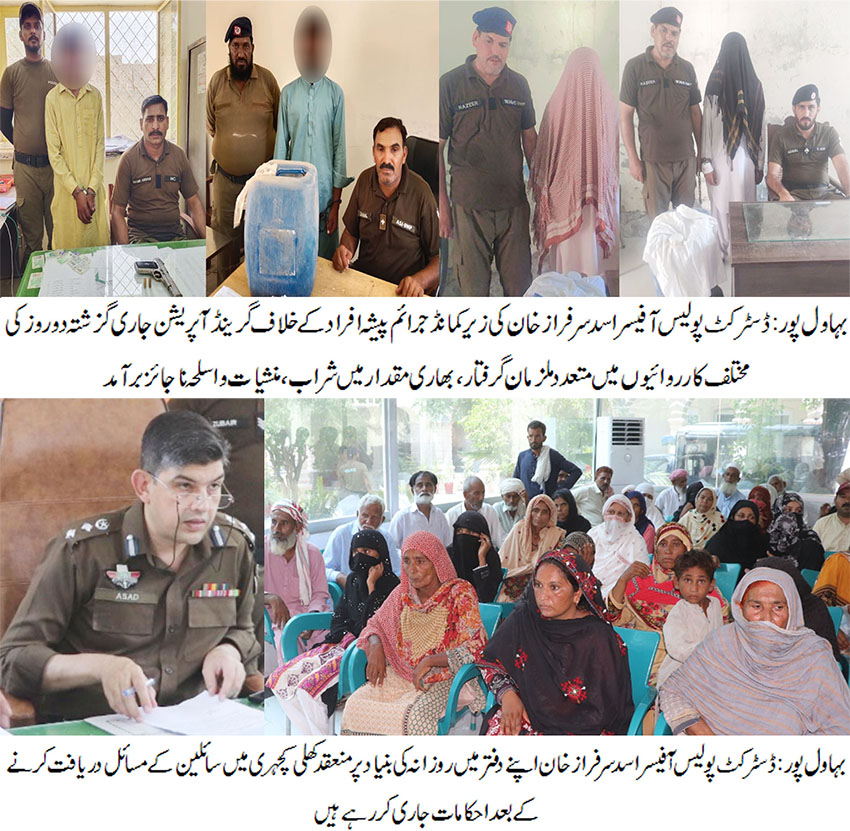 بہاولپور(       )ڈسٹرکٹ پولیس آفیسر اسد سرفراز خان کا شہریوں کے مسائل ترجیحی بنیادوں پر حل کرنے کیلئے روزانہ کی بنیاد پر اپنے دفتر میں کھلی کچہری کا انعقاد، 55سے زائد شہریوں نے اپنے مسائل ڈی پی او کے سامنے رکھے۔ پراپرٹی کے مقدمات میں جلد ریکوری کرکے رپورٹ پیش کریں، تاخیر کسی صورت برداشت نہیں کی جائے گی، شہریوں کے مسائل حل کرنے کیلئے ہر ممکن وسائل کو بروئے کار لایا جا رہا ہے ،ڈی پی او اسد سرفراز خان