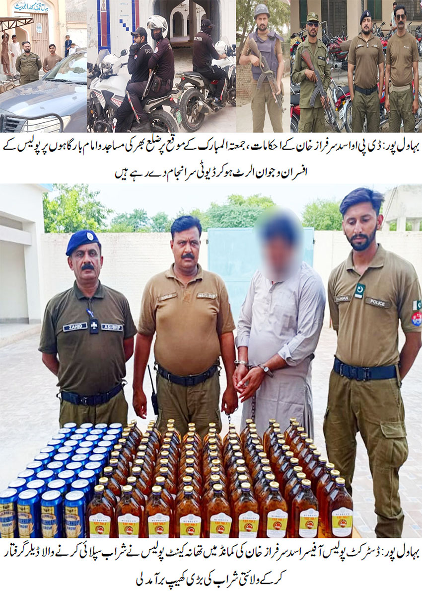 بہاول پور( )ڈسٹرکٹ پولیس آفیسراسد سرفرازخان کی کمانڈ میں تھانہ کینٹ پولیس کی شراب فروشوں کے خلاف کامیاب کارروائی،ولائتی شراب کی بڑی کھیپ برآمد،شراب سپلائی کرنے والا ڈیلرگرفتار، مقدمہ درج ۔ بہاولپور کو منشیات فری زون بنانے کا عزم ہرصورت پورا کیاجائے گا، ڈی پی اواسد سرفرازخان
