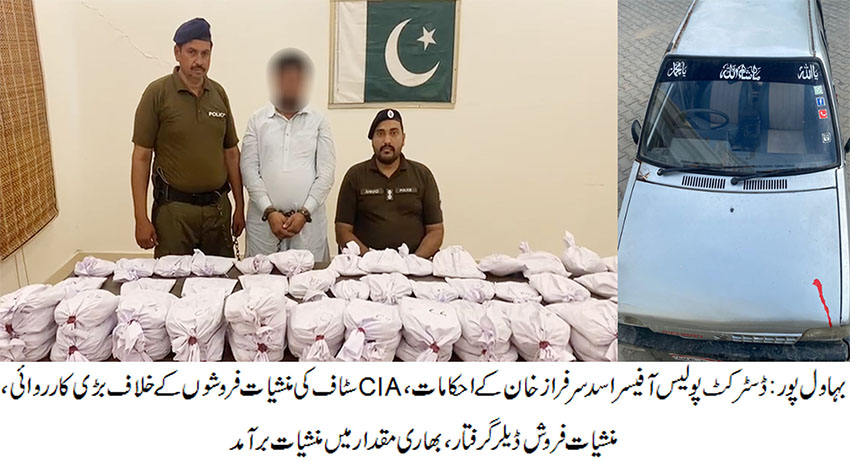 بہاول پور( )ڈسٹرکٹ پولیس آفیسراسد سرفرازخان کے احکامات ، سی آئی اے سٹاف کی منشیات فروشوںکے خلاف کامیاب کارروائی،منشیات سپلائی کرنے والا ڈیلر گرفتار،بھاری مقدار میںمنشیات برآمد، ملزم پابند سلاسل۔ جرائم پیشہ افراد کا تعاقب جاری رکھا جائیگا، ڈی پی او اسد سرفرازخان